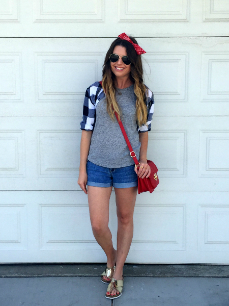 Plaid shirt with denim shorts, red bandana, cross-body and slides.