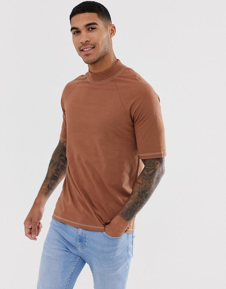 Asos DesignAsos Design Raglan T-shirt With Turtleneck And Contrast Stitching In Brown - Brown