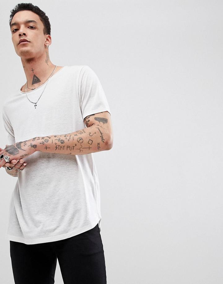 - Asos Design Longline T-shirt With Raw Scoop Neck And Curve Hem In Linen Mix In White - White