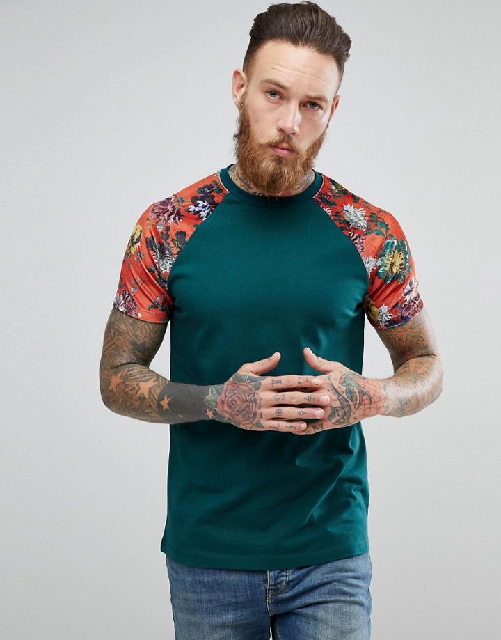 T-shirt by ASOS, Soft-touch velour sleeves, Floral print finish, Crew neck, Raglan sleeves, Fixed trims, Regular fit - true to size. ASOS menswear shuts down the new season with the latest trends and the coolest products, designed in London and sold across the world. Update your go-to garms with the new shapes and fits from our ASOS design team, from essential tees to on-point outerwear, and jeans from skinny to straight and beyond.