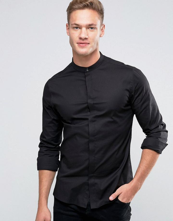 AsosAsos Skinny Shirt In Black With Grandad Collar And Gunmetal Popper - B