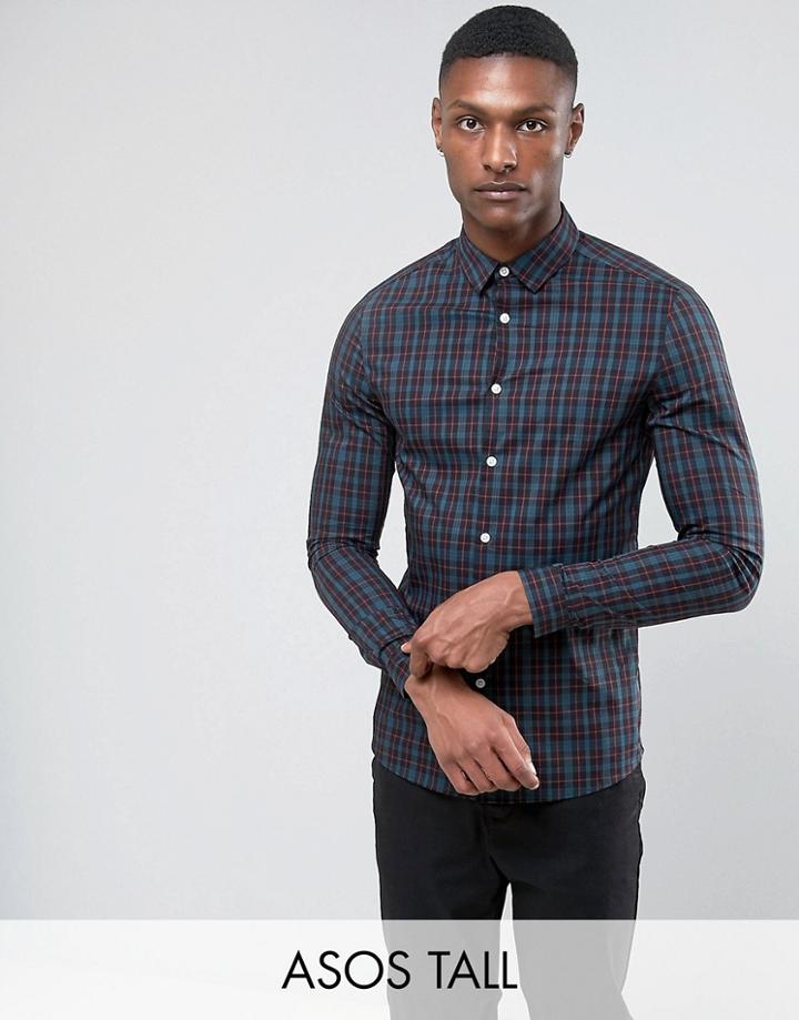 AsosAsos Tall Skinny Check Shirt In Green - Navy