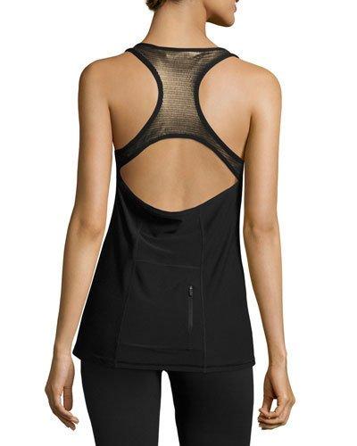 X by Gottex stretch-jersey tank. Approx. 26L from shoulder to hem. Scoop neckline; mesh racerback. Sleeveless. Cutout back. Back zip pocket. Fitted silhouette. Straight hem. Pullover style. Polyester/spandex. Machine wash. Imported.