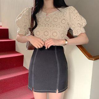 ClematraBalloon-sleeve Pointelle Knit Top / Mini A-line Skirt
