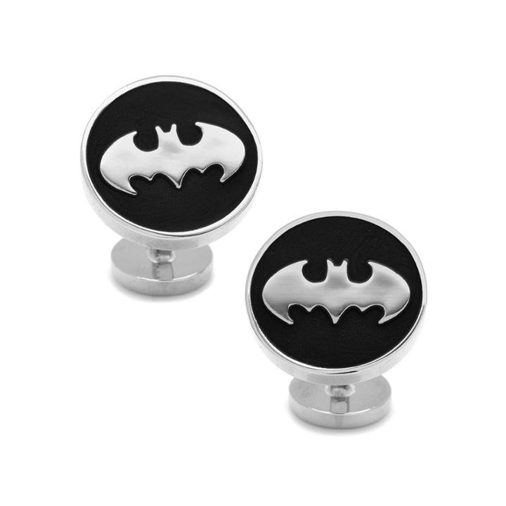 Celebrate one of the greatest superheroes of all time with these black recessed Batman logo cuff links. fixed back closure approx. ¾ x ¾ plated base metal clean with polishing cloth imported