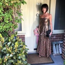 Carmen Marc Valvo jacquard gown. Beaded Grecian neckline. Sleeveless; cut-in shoulders. Banded waist. Pleated A-line silhouette. Hem hits floor. Polyester/metallic/other fibers. Acetate lining. Dry clean. Imported.