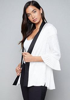 Coveted jacket in a silky jacquard design with breezy pleated back and flare-sleeve cuffs. Piping detail shawl collar and back belt create a playful robe look. Vented hem. No closures.