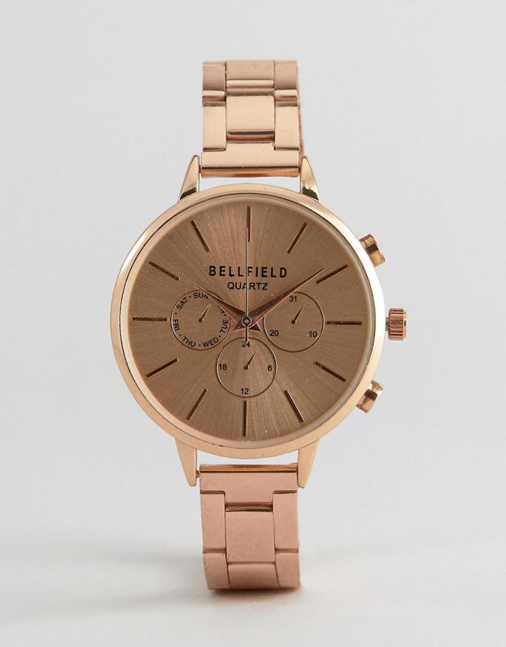Watch by Bellfield, Staineless steel mesh strap, Rose gold-tone stainless steel case, Three hand movement, Sunray dial, Sub-dial design, Dash indices, Single crown to side, Twin pushers, Folding fastening, Sub dials are for decoration only, Presented in a gift box. Inspired by vintage outerwear, Bellfield offers well-constructed modern womenswear with a sense of fun and adventure. Designed by a small London-based team of creatives, Bellfield draw from classic British heritage wear and old Americ
