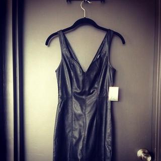 Black faux leather mini dress with a v-neckline and front pocket detailing.