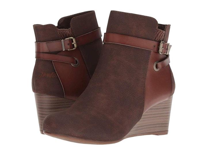 Perfect your fall look with the poised Blowfish Batik wedge booties. Upper made of man-made material. Inner zipper closure with decorative buckle detail. Lining made of textile. Lightly cushioned stationed insole. Wedged stacked heel. Man-made sole. Imported. Measurements: Heel Height: 2 1 2 in Weight: 11 oz Circumference: 9 1 2 in Shaft: 5 3 4 in Product measurements were taken using size 8 width M. Please note that measurements may vary by size. Weight of footwear is based on a single item not a pair.