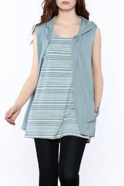 Striped sleeveless top and solid sleeveless zipper hooded vest with pockets.