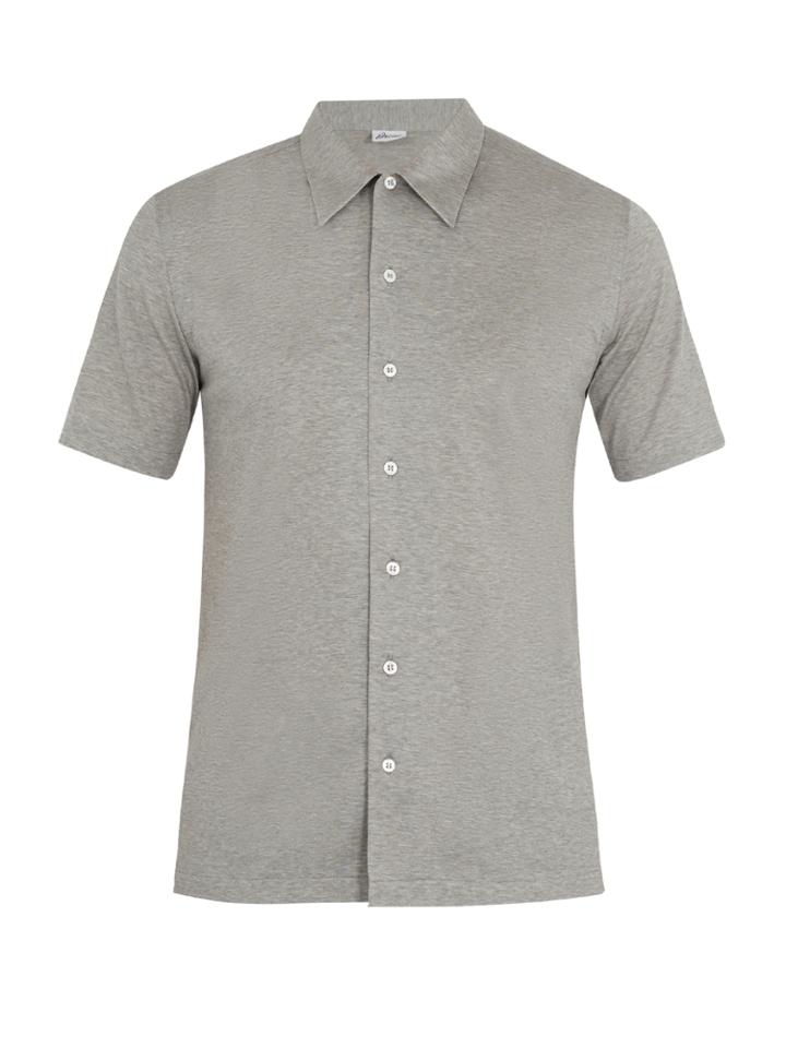Brioni's grey cotton-jersey shirt combines the fabrication of a T-shirt with the features of a shirt - watch it work just as well with jeans as it does with tailored trousers. It's shaped to a short-sleeved silhouette with a point collar and has side hem slits to ease the slim fit. Runs true to size.