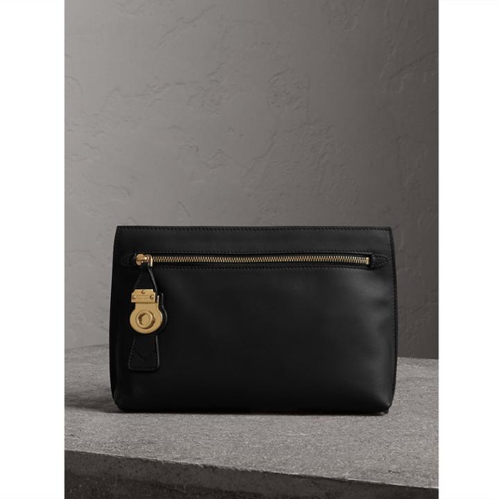 A pouch in our exclusive new Trench Leather, defined by a distinctive lock. Carry it casually underarm, or using the back wristband. 29 x 19cm/11.4 x 7.5in Outer: 100% calf leather Lining: 68% polyester, 32% polyurethane Zip closure Hand-painted edges Embossed Burberry lettering at the back Made in Italy