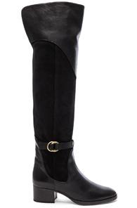 Suede upper with leather sole. Made in Italy. Shaft measures approx 520mm/ 20.5 inches in height. Approx 50mm/ 2 inch heel. Side buckle accent. Back slit. Leather detail throughout.