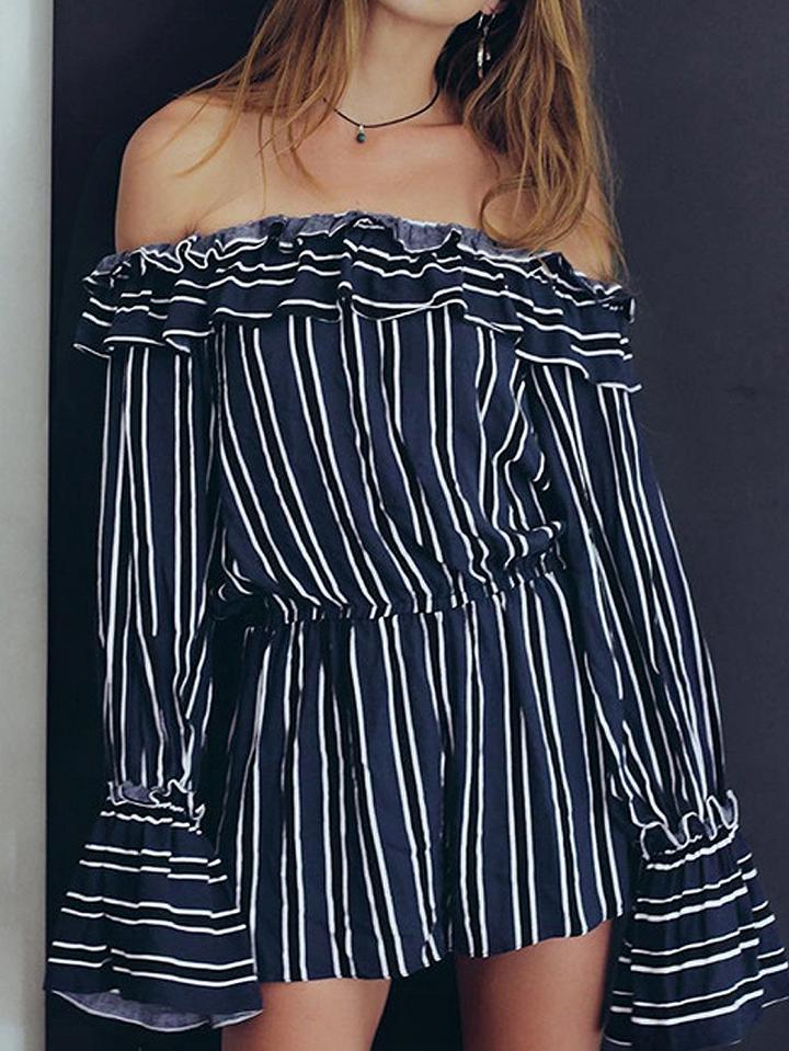 ChoiesChoies Blue Off Shoulder Ruffle Trim Split Flared Sleeve Romper Playsuit