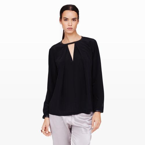 Understated bohemian, in pleated silk. Silk. Rounded contrast neckline with V-cutout at center. Pleated front. Long-sleeved. Contrast trim with single decorative snap closure at cuffs. Keyhole with hook-and-eye closure at back. Dry clean only. From Club Monaco Women's and available in size XS in color Black