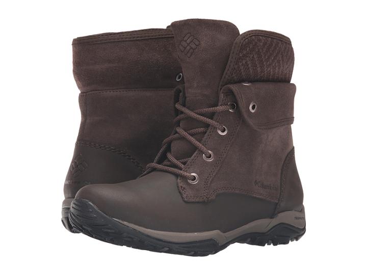 Trudge through the cold-weather muck in style wearing the Columbia Cityside Fold Waterproof boot. ; Omni-Tech waterproof, breathable membrane locks out water, while allowing moisture to escape. ; Waterproof PU-coated leather and suede uppers. ; Fold-over knit collar. ; Lace-up closure. ; Metal eyestays. ; Breathable fabric lining. ; Textile footbed. ; Techlite midsole provides responsive cushioning, impact absorption, and high energy return. ; Non-marking Omni-Grip Advanced Traction outsole delivers optimal traction. ; Imported. Measurements: ; Weight: 1 lb ; Shaft: 7 in ; Product measurements were taken using size 9, width B - Medium. Please note that measurements may vary by size.