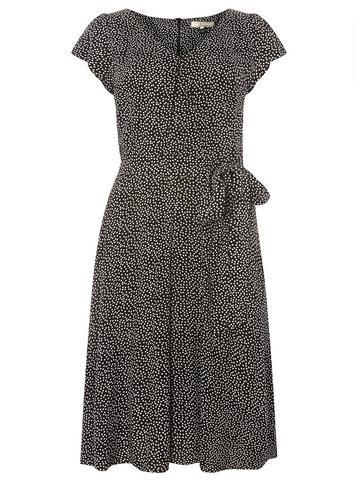 Billie & Blossom tall viscose dress with black base and white spot print. Wearing length is 105cm. 100% Viscose. Machine washable.