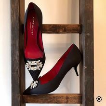 Heels by Dune, Textile upper, Slip-on style, Sharp point toe, Brooch detail, Pointed high heel. Defining their customer through attitude rather than age, Dune's in-house design team look to fashion capitals for originality and detail. Luxe finishes meet sculptural shapes across a range of heeled shoes, embellished ballet flats and dawn-to-dark bags.