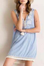 Gorgeous cornflower blue drop waist dress has embroidery with a tassel tie along the bodice giving it a boho vibe. Dress is fully lined.