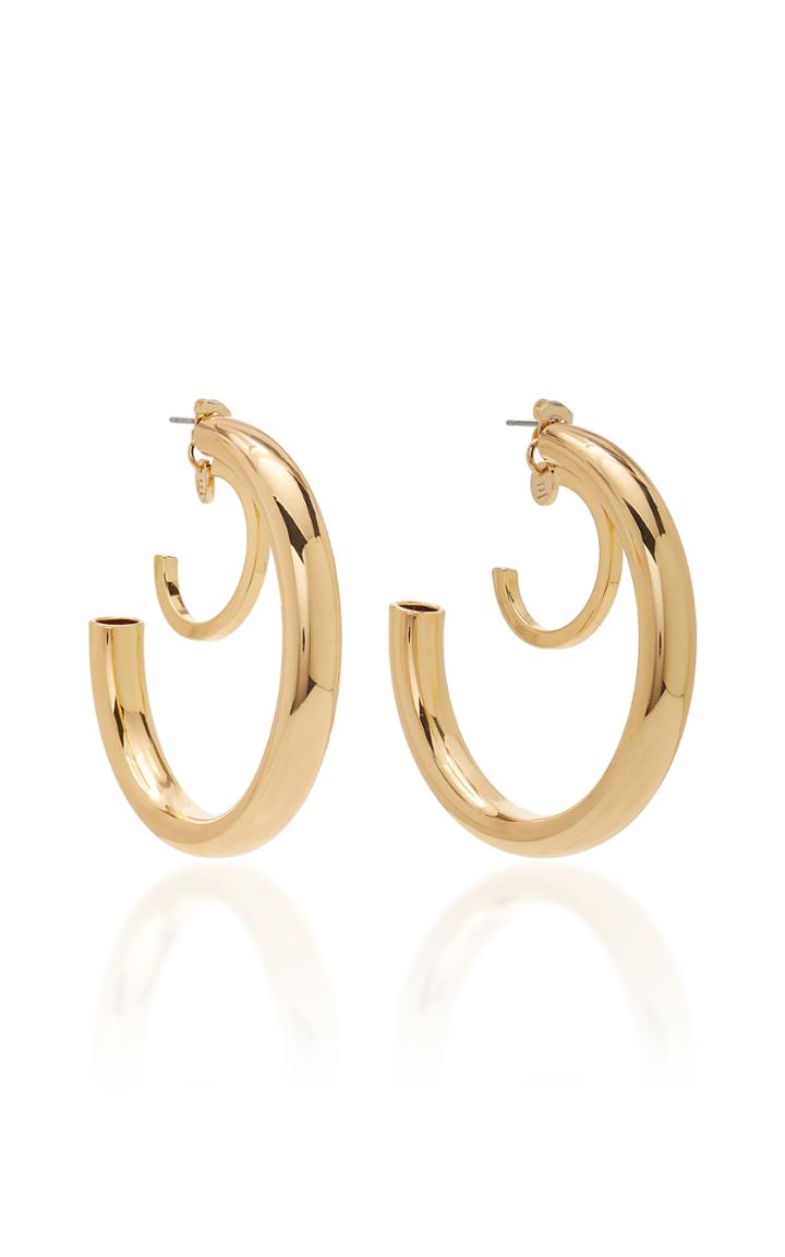 Designed with a unique doubled silhouette, Etesian's 'Cosma' hoop earrings are made from brass plated with 24-karat yellow gold.