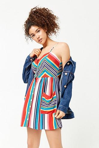 DetailsA woven mini dress featuring a chevron design with multicolored stripe details, adjustable cami straps, sweetheart neckline, button front, front patch pockets, and a back smocked panel.Content + Care- 100% rayon- Hand wash cold- Made in ChinaSize + Fit- Model is 5'8.5%22 and wearing a Size Small- Bust to hem: 27.75%22- Chest: 33%22- Waist: 27%22