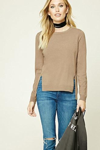 details Forever 21 Contemporary - A ribbed knit sweater featuring a round neckline, long sleeves, side vents, and ribbed trim. Content + Care - 100% acrylic- Hand wash cold- Made in China Size + Fit - Model is 5'7 and wearing a Small- Full length: 24.5- Chest: 36- Waist: 36- Sleeve length: 23.5- Vent length: 7.5