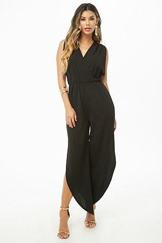 DetailsA ribbed knit jumpsuit featuring a shirred surplice neckline, sleeveless cut with ruching at the shoulders, V-back with self-tie support strap, elasticized waist, slits at the legs, and a relaxed silhouette.- This is an independent brand and not a Forever 21 branded item.Content + Care- 95% polyester, 5% spandex- Hand wash coldSize + Fit- Model is 5'9%22 and wearing a Small- This product tends to run smaller