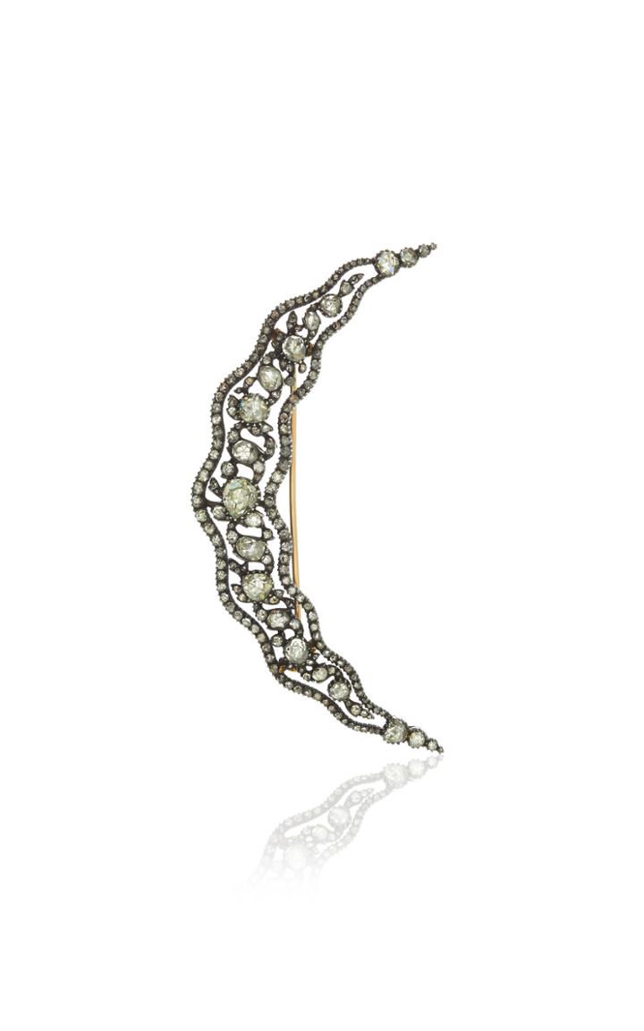 Fred Leighton's antique crescent brooch from 1865 is designed with rose-cut diamonds totaling approximately 4.25-carats set in a large crescent mounted in silver top yellow gold.