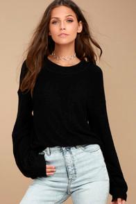 Everyday will feel like Friday with the Free People TGIF Black Sweatshirt! Irresistibly soft, and slightly fuzzy, stretch knit sweeps across a wide, rounded neckline, then falls into an oversized bodice and long, dolman sleeves with puffy cuffs. Ribbed details at the neckline, sleeve cuffs, and waistband.