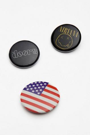 Set of three vintage band pins. Choose from the UK collection featuring Rolling Stones & David Bowie or the USA vibe with Nirvana and the Doors.