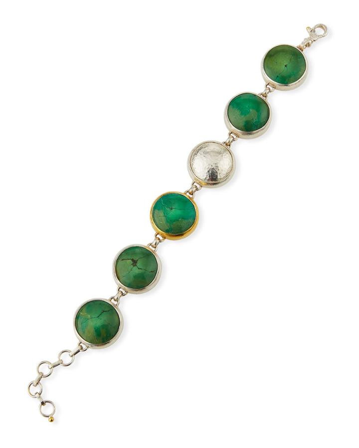 Galapagos turquoise bracelet by Gurhan. Sterling silver with 24-karat gold plating. Round Chinese turquoise bezels. Adjustable; lobster clasp. Approx. 7L.