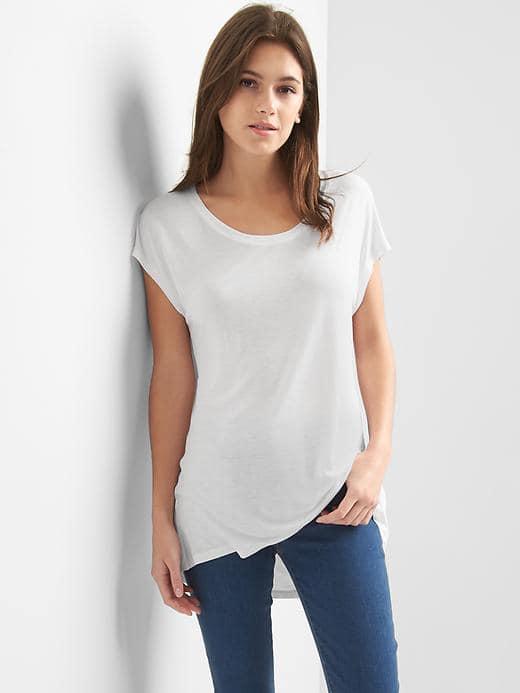 Gap Soft jersey knit. Cap sleeves. Scoop neck. Curved hem is slightly longer at back. Straight silhouette with an easy, relaxed fit. Hits below the hip. Model is 5'10"/178 cm, bust 32.5"/83 cm, waist 23.5"/60 cm, hips 35"/89 cm, is wearing a regular Gap size S.