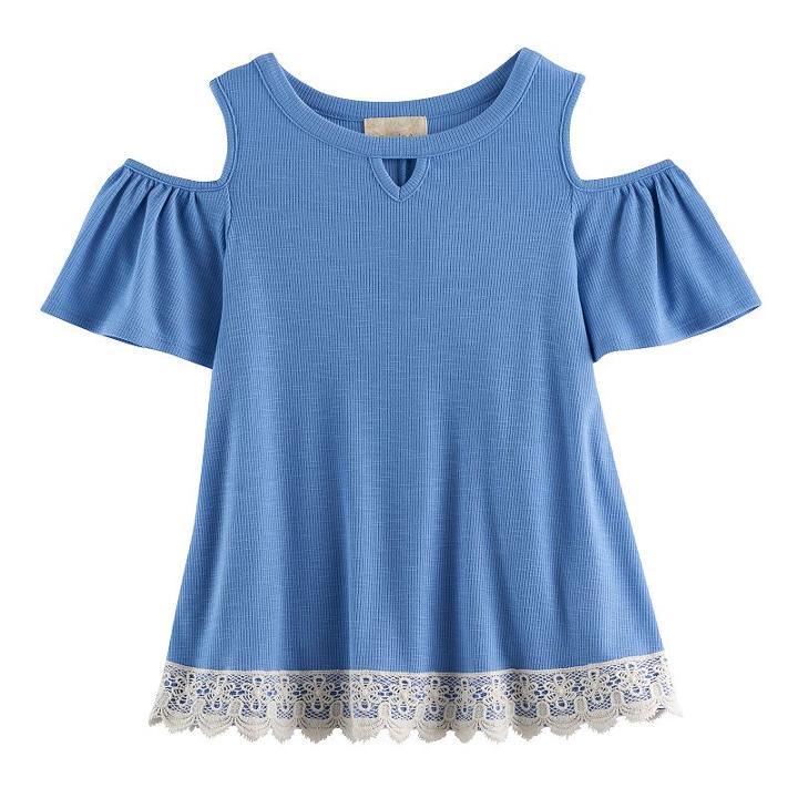 - Girls 7-16 Rewind Patterned Ribbed Cold-shoulder Lace Trim Top, Girl's, Size: Large, Blue