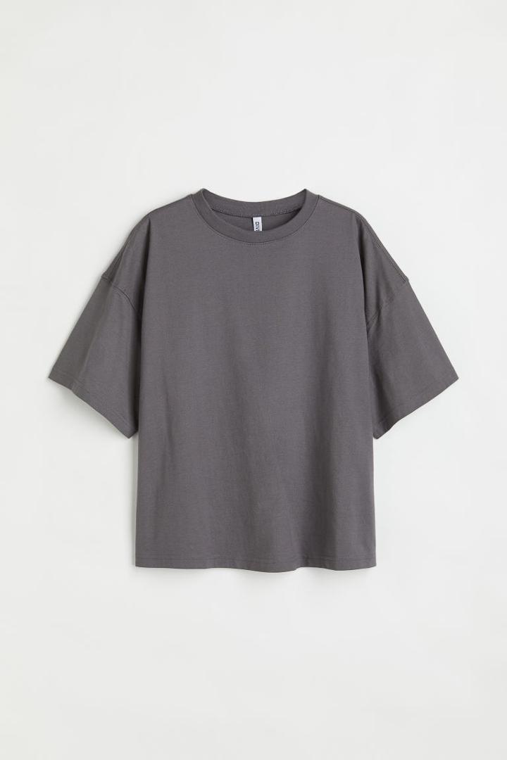 Boxy T-shirt in soft cotton jersey. Ribbed crew neck, dropped shoulders, and wide sleeves ending just above elbow.