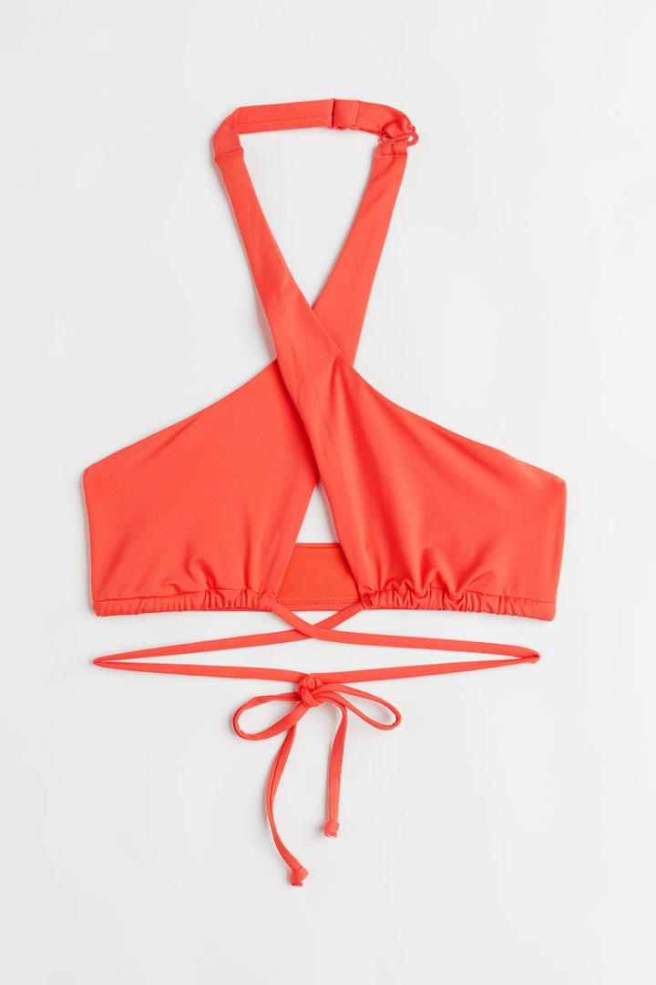 Lined, non-wired bikini top with halterneck that can be twisted for a crossover effect at front. Metal fastener at back of neck and narrow ties at lower edge.