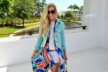 A simple, young, feminine look with neutrals from top to bottom, topped with several color accents via accessories.