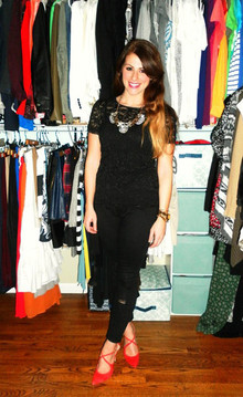 ...make a striped sequin top more casual with a chambray shirt worn as a jacket, classic navy trousers, and ballet flats.