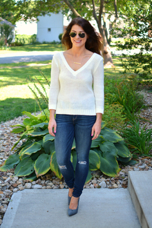 ...a coral dress for transitioning from summer to fall with gray suede pumps.