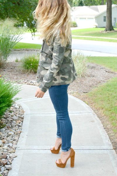 ...a camo jacket, high-waisted denim, and sky-high platform sandals for a casual but elevated fall outfit.