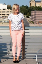 This UCLA student keeps her look casual but girly with a polka dot print chiffon top, denim shorts, and TOMS.