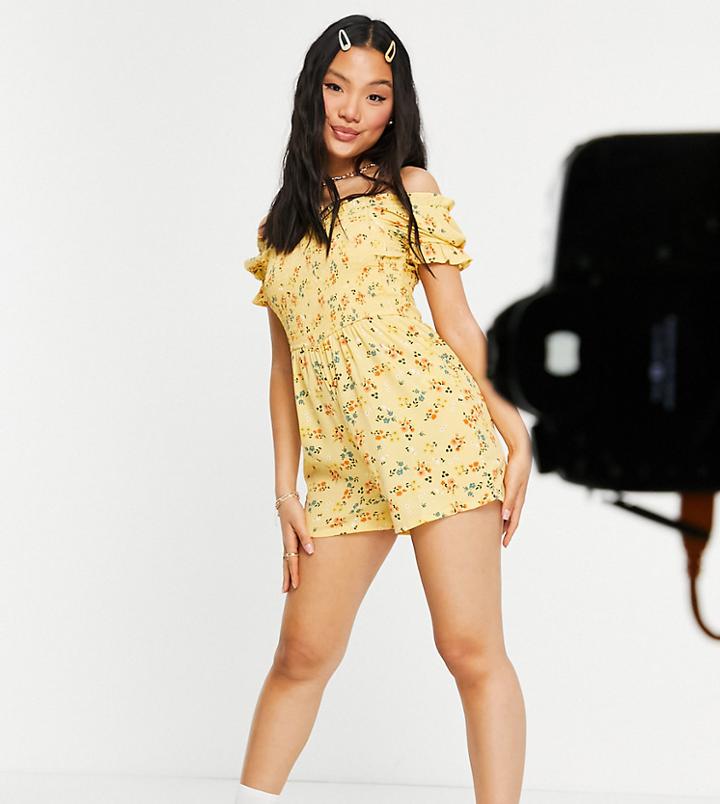 InfluenceInfluence Petite Off Shoulder Romper In Yellow Floral Print