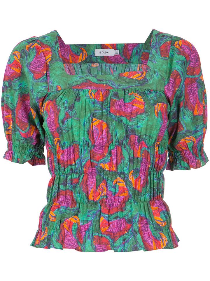 Purple and green cotton printed top from Isolda featuring a straight neck, short sleeves and a floral print. Size: 42. Gender: Female.