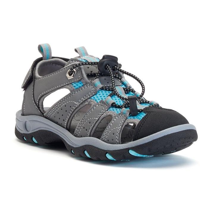 She'll take on the outdoors with comfort and breathability wearing these girls' West Lake sandals from Itasca. Sandal Features Bungee & toggle upper Breathable openings Adjustable heel strap Treaded sole Sandal Construction Manmade & mesh upper Fabric lining EVA midsole TPR outsole Sandal Details Closed toe Hook & loop closure Padded footbed Size: 4. Color: Grey. Gender: Female. Age Group: Kids. Pattern: Other. Material: SyntheticMesh.