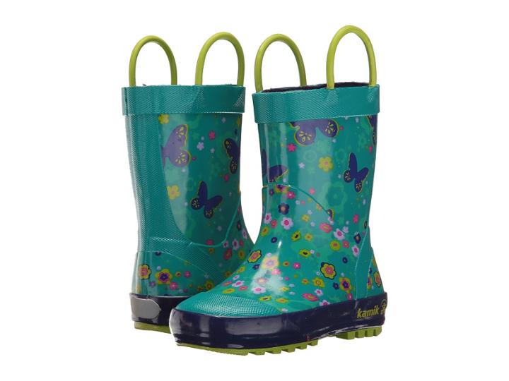 The rain won't get you down! Fly high with these cute Flutter rainboots by Kamik Kids! ; Synthetic upper featuring butterflies and flowers. ; Two handles make it easy for kids to pull them on and off. ; Fabric lining for a good in-shoe feel. ; Comfort EVA footbed for longer lasting wear. ; PUDDLE vulcanized rubber outsole to stomp out the rain! ; Imported. Measurements: ; Weight: 1 lb ; Circumference: 10 1 2 in ; Shaft: 7 in ; Product measurements were taken using size 2 Little Kid, width M. Please note that measurements may vary by size. ; Weight of footwear is based on a single item, not a pair.