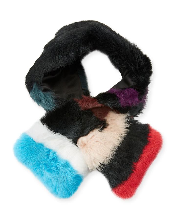 Eugenia Kim Kira scarf in multicolored, dyed rabbit fur (China). May be styled multiple ways. Pull-through style. Polyester. Imported.