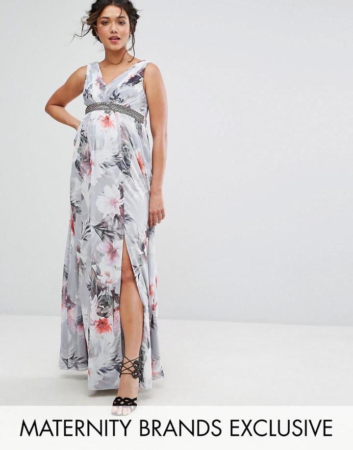 Maternity dress by Little Mistress Maternity, Lined chiffon, All-over floral print, Plunge neck, Embellished empire line, Designed to skim over your growing bump, Side split, Shirred back, Regular fit - true to size, Designed to fit through all stages of pregnancy, Machine wash, 100% Polyester, Our model wears a UK 8/EU 36/US 4 and is 173cm/5'8 tall, Exclusive to ASOS. Little Mistress take hot-off-the-runway trends to create their collection of fun and feminine party dresses. With the same fas