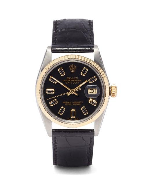 Lizzie Mandler opulently reimagines this vintage Rolex Datejust with 10 baguette-cut onyx indices - believed to impart self-confidence. Originally Swiss made, it's restored in Los Angeles by expert watchmakers with an 18kt gold and stainless Oystersteel case with a customised black face and fluted bezel, then complete with a black crocodile-effect leather strap.