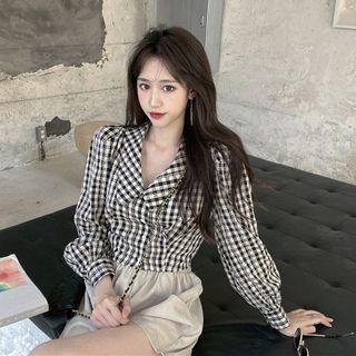 FlowerisqueLong-sleeve Embroidered Gingham Cropped Blouse