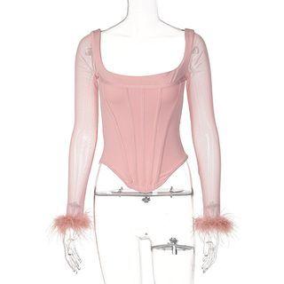 LareedaLong-sleeve Fluffy Trim Mesh Panel Corset Top